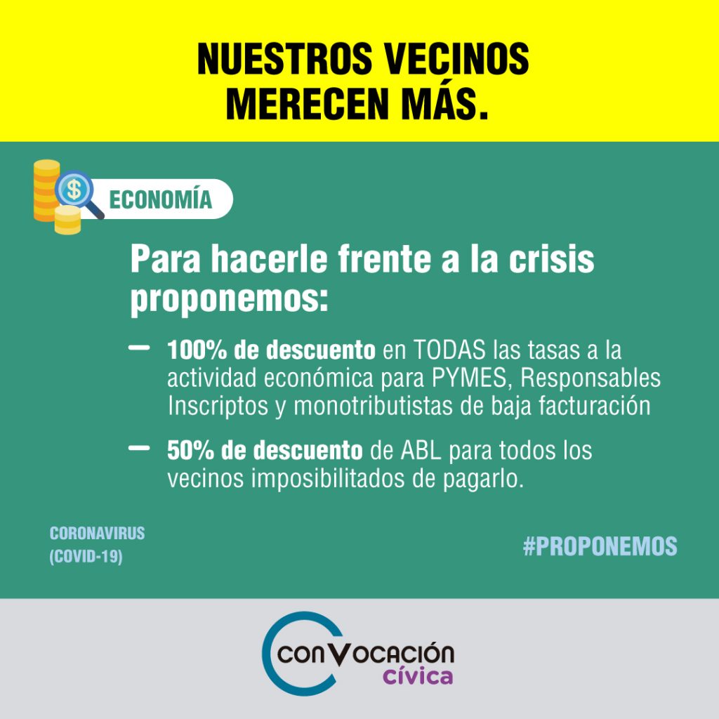 “Le propusimos al Intendente varios descuentos de tasas para los más golpeados por la crisis: vecinos comerciantes y prestadores de servicios que están teniendo muchas dificultades para facturar en la actualidad. Y aún cuando vemos con buenos ojos la disposición de hacer algunos descuentos, nos parece que lo que están ofreciendo ahora no basta,” indicó por su parte el Concejal Manuel Abella. “Los comercios pagan varias tasas, no solo la de Inspección de Comercio e Industria, y el descuento que ofrece el Municipio no es sobre la totalidad de la tasa sino sobre su base fija; no es realmente de 50% sobre la tasa,” siguió. “El Intendente puede mirar los números del Municipio, hacer algunos ajustes, y hacer un poco más por los vecinos considerando el tamaño de cada comercio. 100% en descuento de todas las tasas de actividad económica para PYMES y comerciantes de baja facturación es algo realizable,” dijo Abella para finalizar.